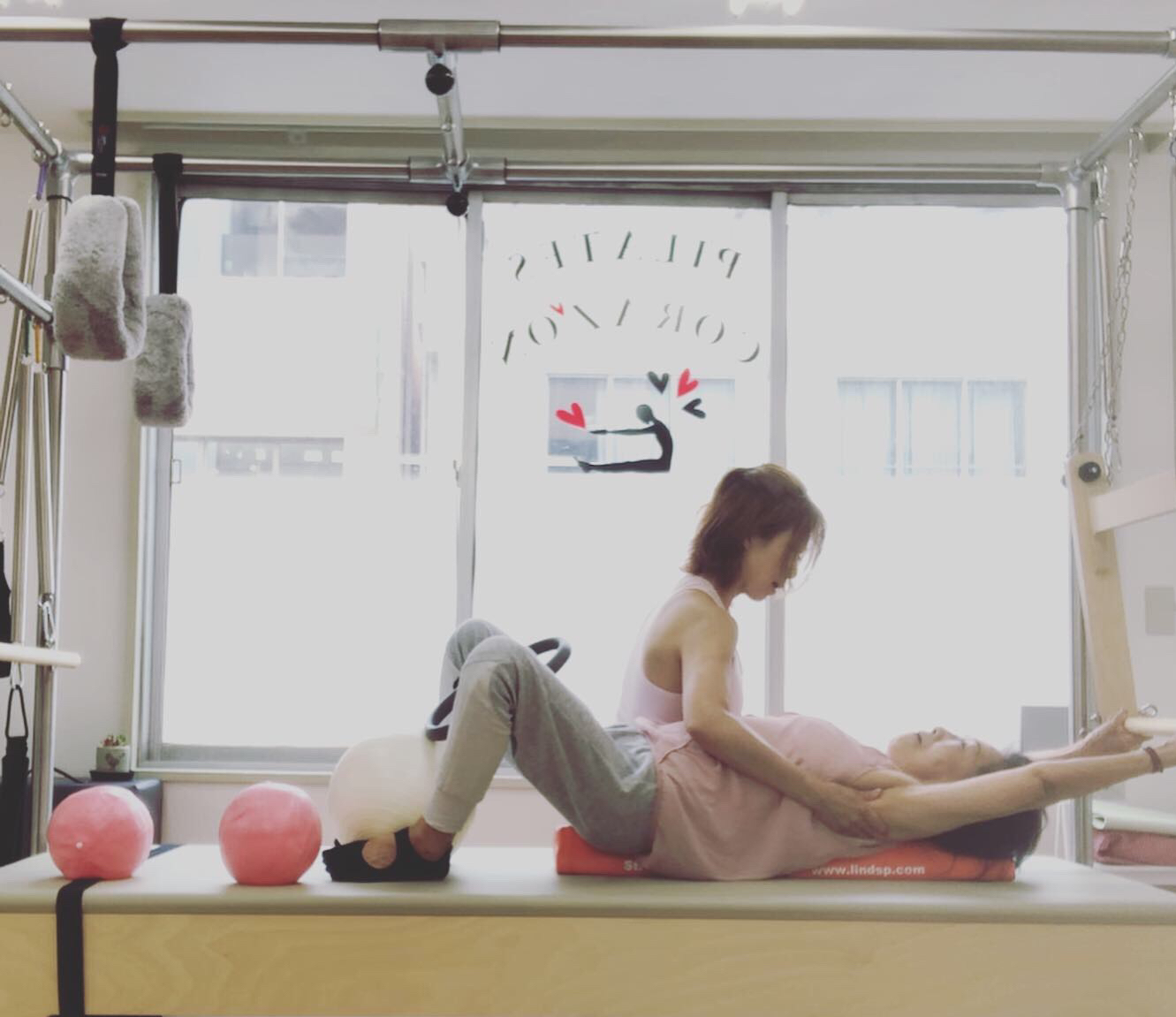 おふたり同時にピラティスタワーを使用したキャデラックピラティスをご受講いただきます。